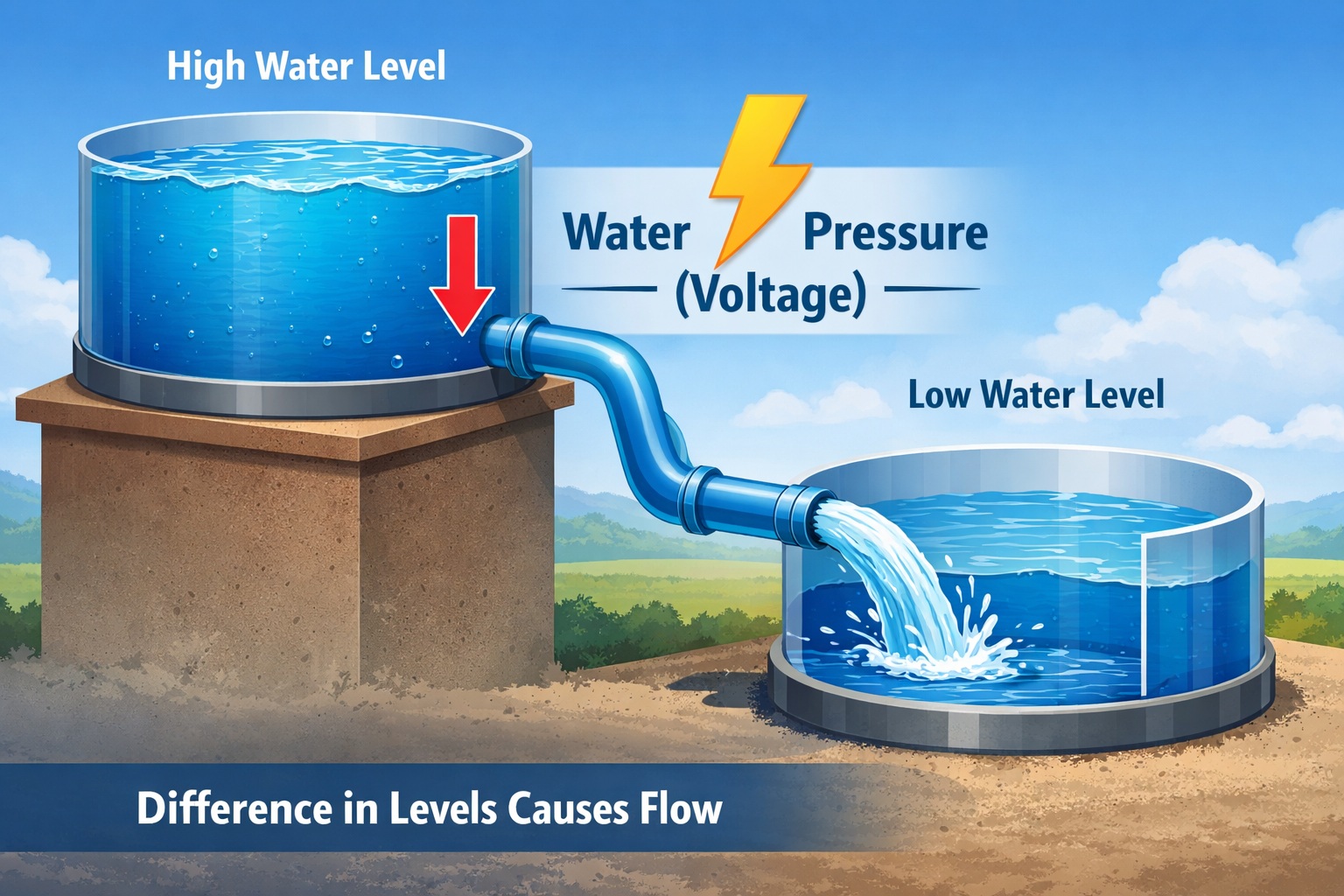 But if one tank is higher than the other, water begins to flow downward.