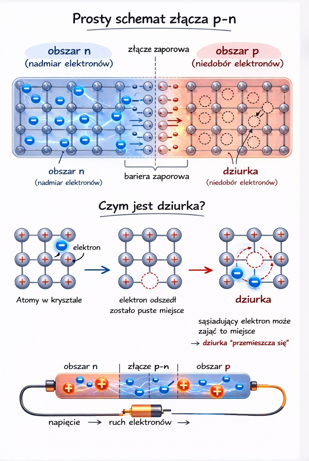 W półprzewodnikach nośnikami ładunku są nie tylko elektrony, ale również tzw. „dziury” — miejsca, w których brakuje elektronu.