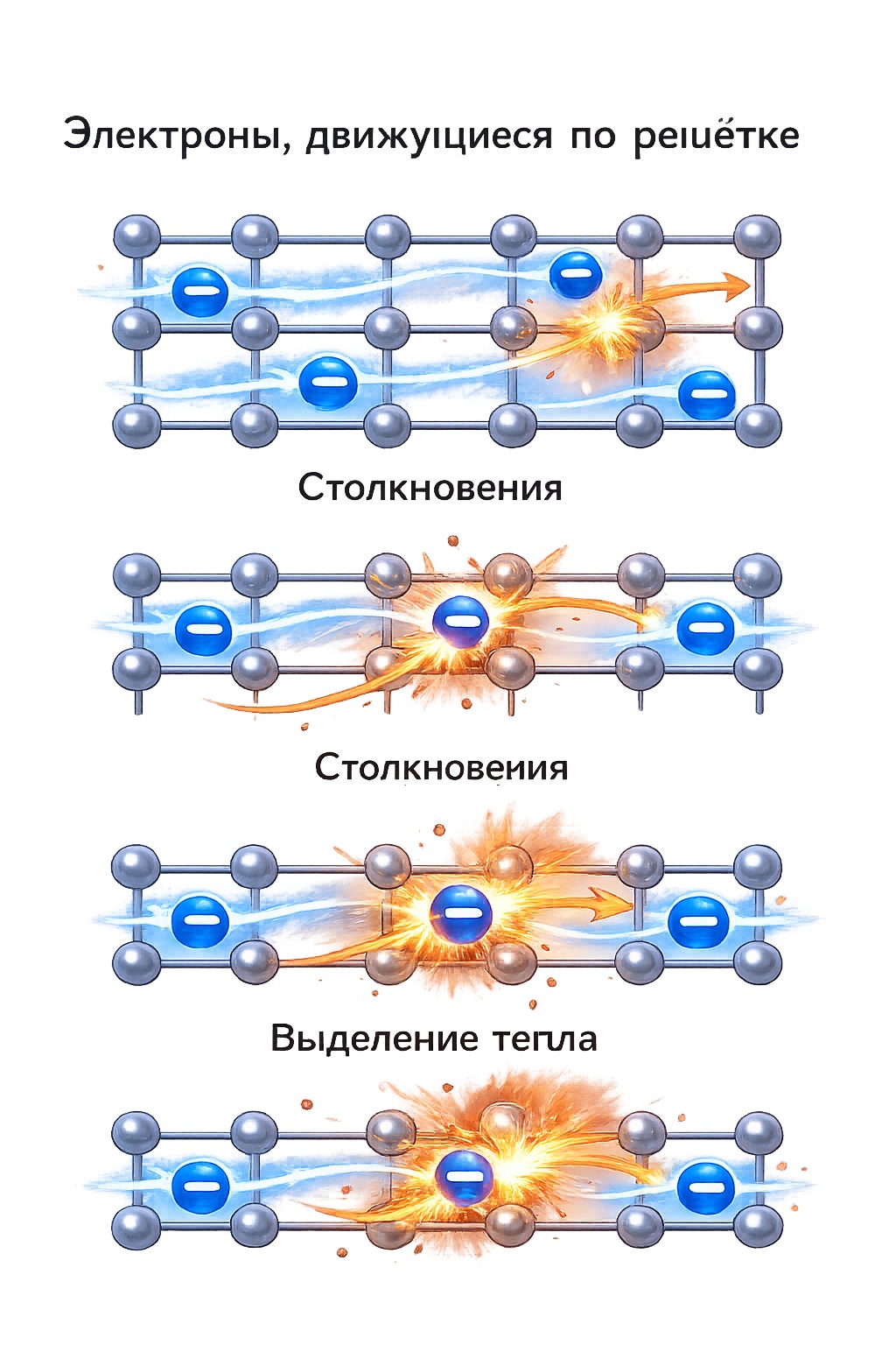 Когда электроны движутся по проводнику, они сталкиваются с атомами кристаллической решётки.