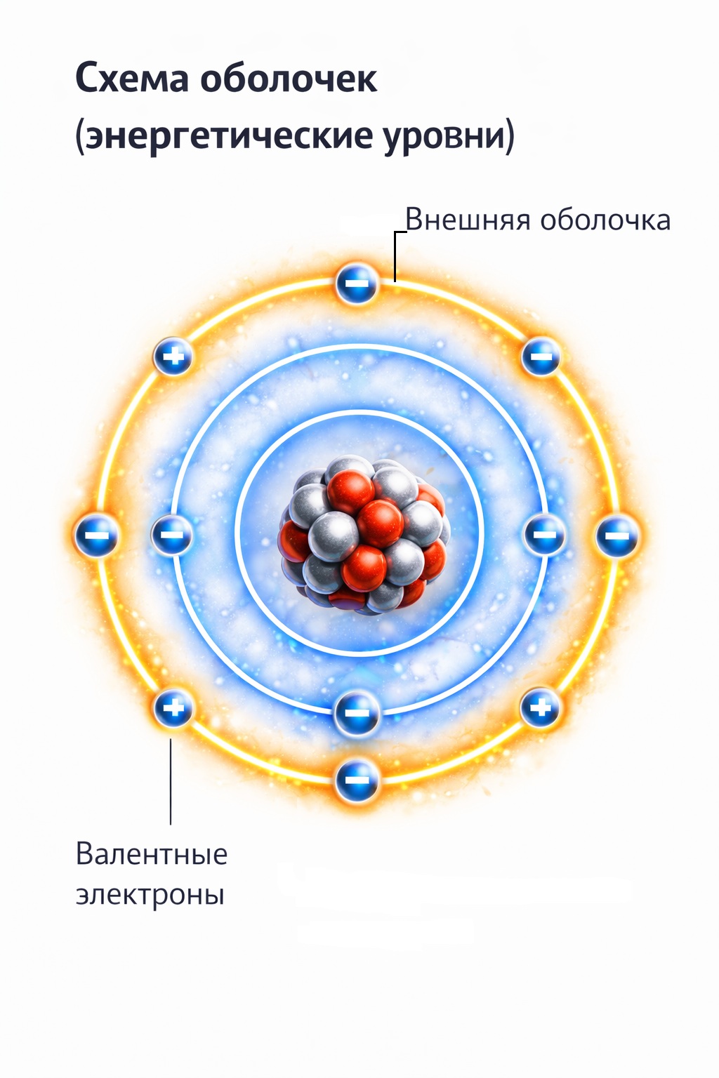Электроны располагаются вокруг ядра на энергетических уровнях.