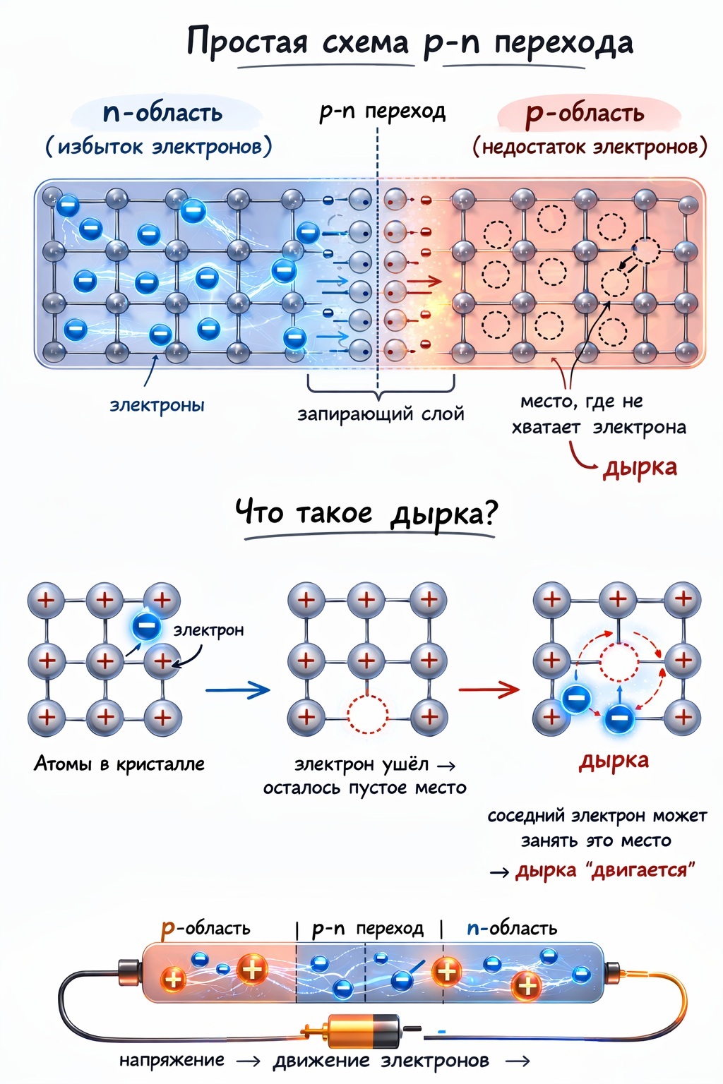 Именно управление движением электронов и «дырок» лежит в основе работы:
