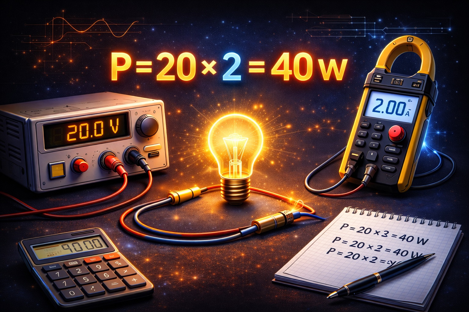 Представим устройство, подключённое к источнику напряжения 20 В, через которое протекает ток 2 А.